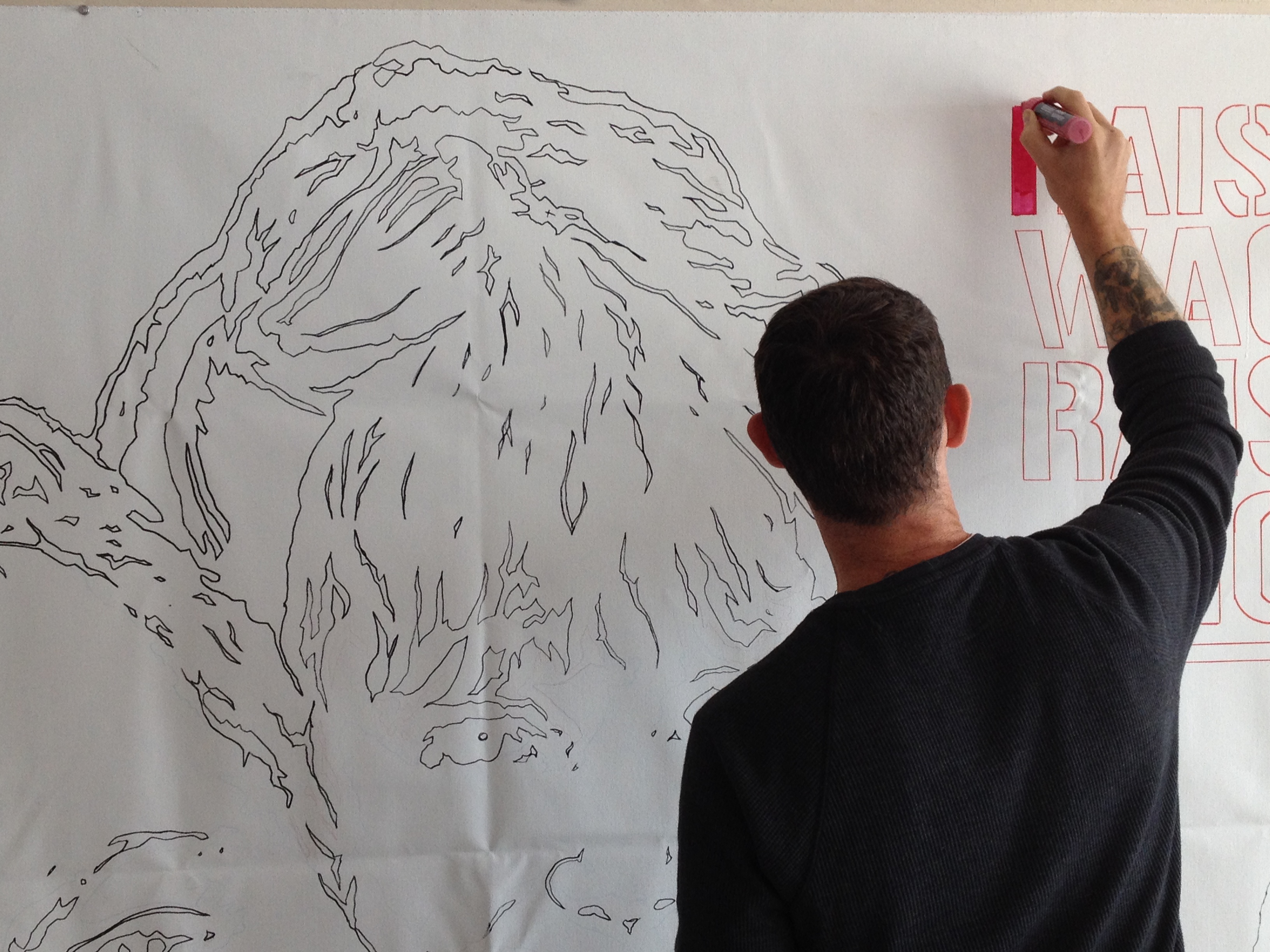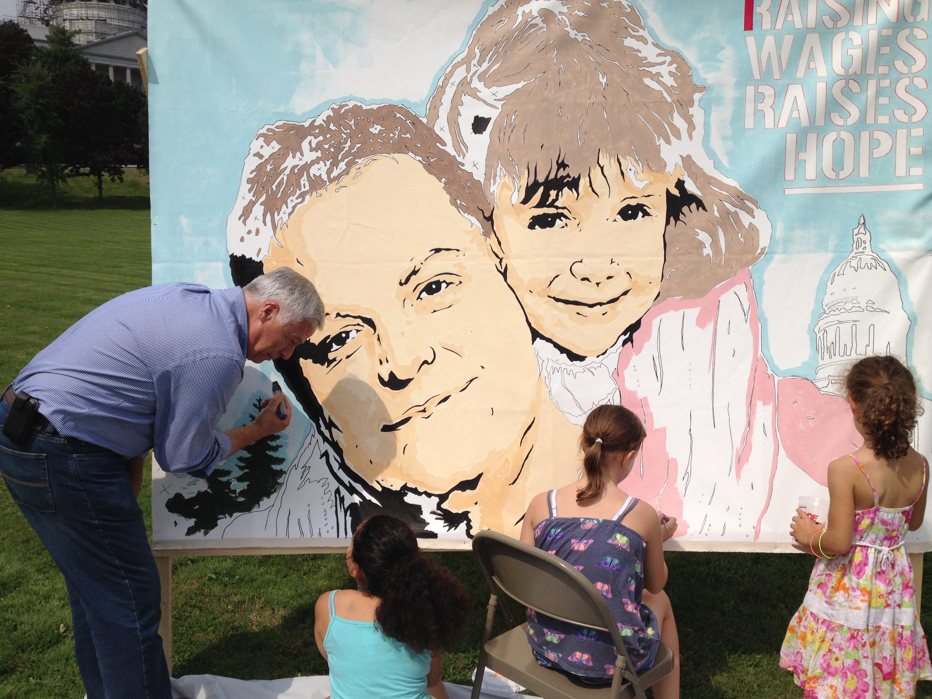 Working with Chris Stain, a Maine-specific concept was developed, which we finalized in a studio in Winthrop, ME at the studio of Maine artist Peter Precourt. We then moved it to Capitol Park, on the lawn in front of the state capital building. Many people participated under the watchful eye and caring instruction of Stain — kids and their parents, union activists, community partners. Visiting politicians, chief among them gubernatorial candidate Mike Michaud, also picked up some paint and joined the fun.
